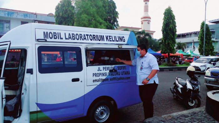 Amatan Kalesang.id, Kamis (7/4/2022) petang tadi, mobil laboratorium keliling milik BPOM Malut terparkir tepi jalan pantai Falajawa Satu, Kelurahan Muhajirin, Kecamatan Ternate Tengah, Kota Ternate. Mobil tersebut dijadikan sentral uji sampel kue dan makanan takjil.