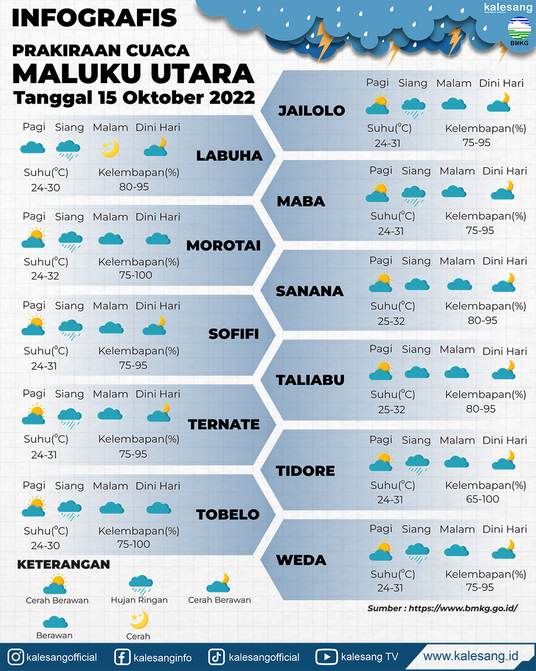 Infografis: Prakiraan Cuaca Maluku Utara Tanggal 15 Oktober 2022 Infografis By kalesang On Okt 14, 2022 Menyukai ini:Suka Memuat... Share FacebookTwitterWhatsAppEmailTelegramPrint