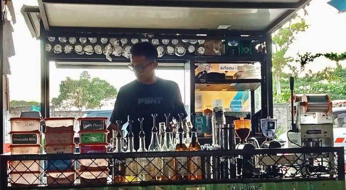 “Yang pertama itu saya memulai dengan berjualan keliling, dagangannya waktu itu juga bukan kopi seperti sekarang ini, melainkan jualan pentolan dan batagor.” Uncapnya.