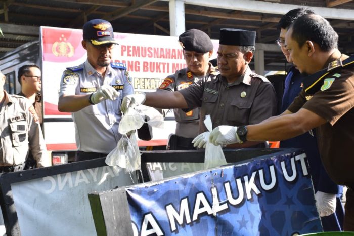 TIDORE (kalesang) – Polres Tidore, Provinsi Maluku Utara, musnahkan 1.419 botol minuman keras (Miras), Kamis (22/12/2022).