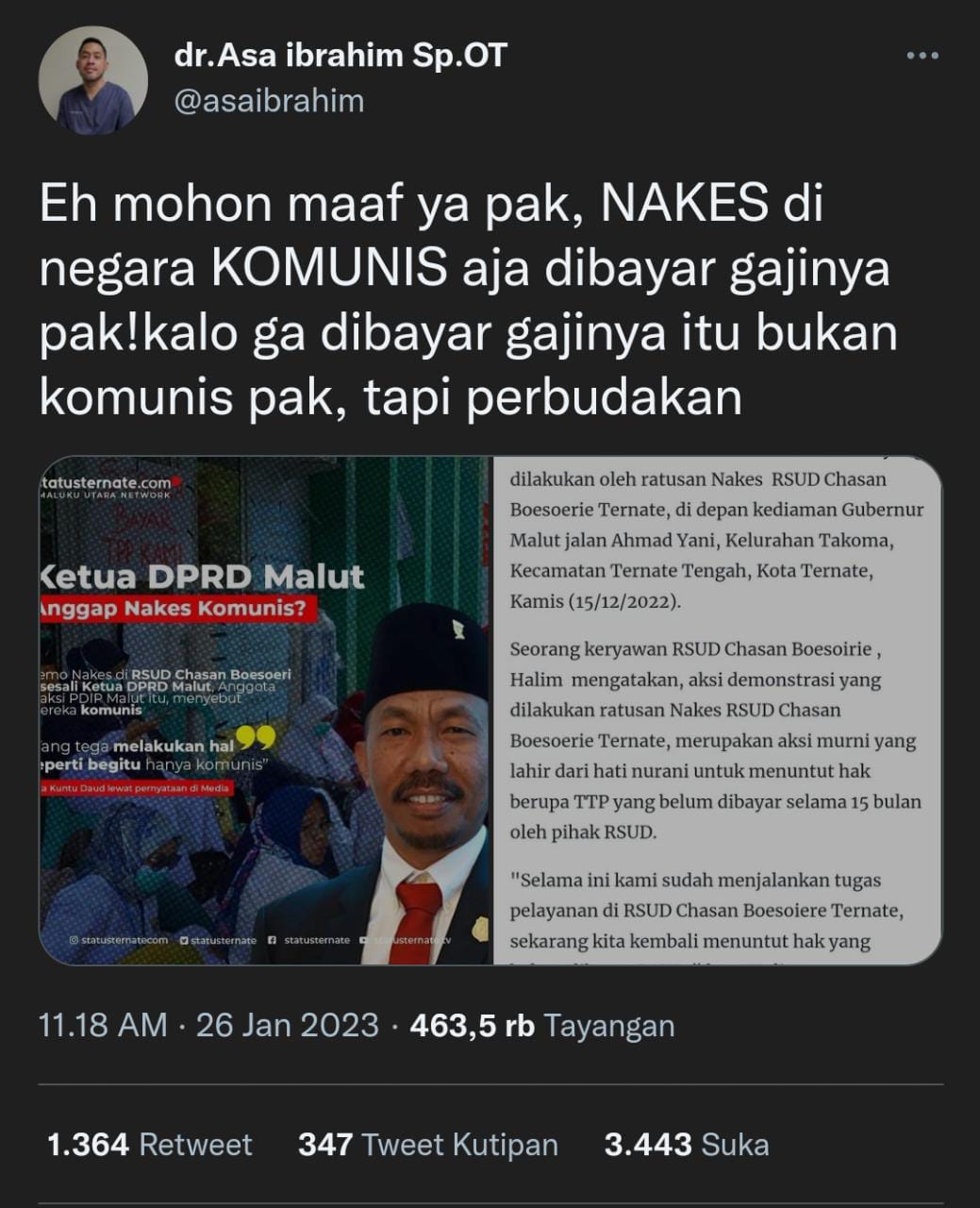 “Eh mohon maaf ya pak, NAKES di negara KOMUNIS aja dibayar gajinya pak! Kalo gak dibayar gajinya itu bukan komunis pak, tapi perbudakan.” Tulis warganet dr. Asa Ibrahim, Sp.OT dengan akun @asaibrahim.