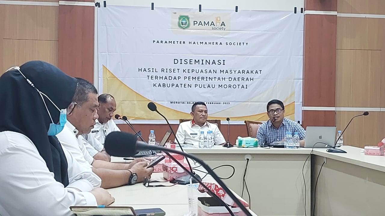 MOROTAI (kalesang) – Paramater Halmahera (PAMARA) Society, menggelar desiminasi hasil riset kepuasan masyarakat, di Kantor Bupati Kabupaten Pulau Morotai, Provinsi Maluku Utata, Rabu (1/2/2023).