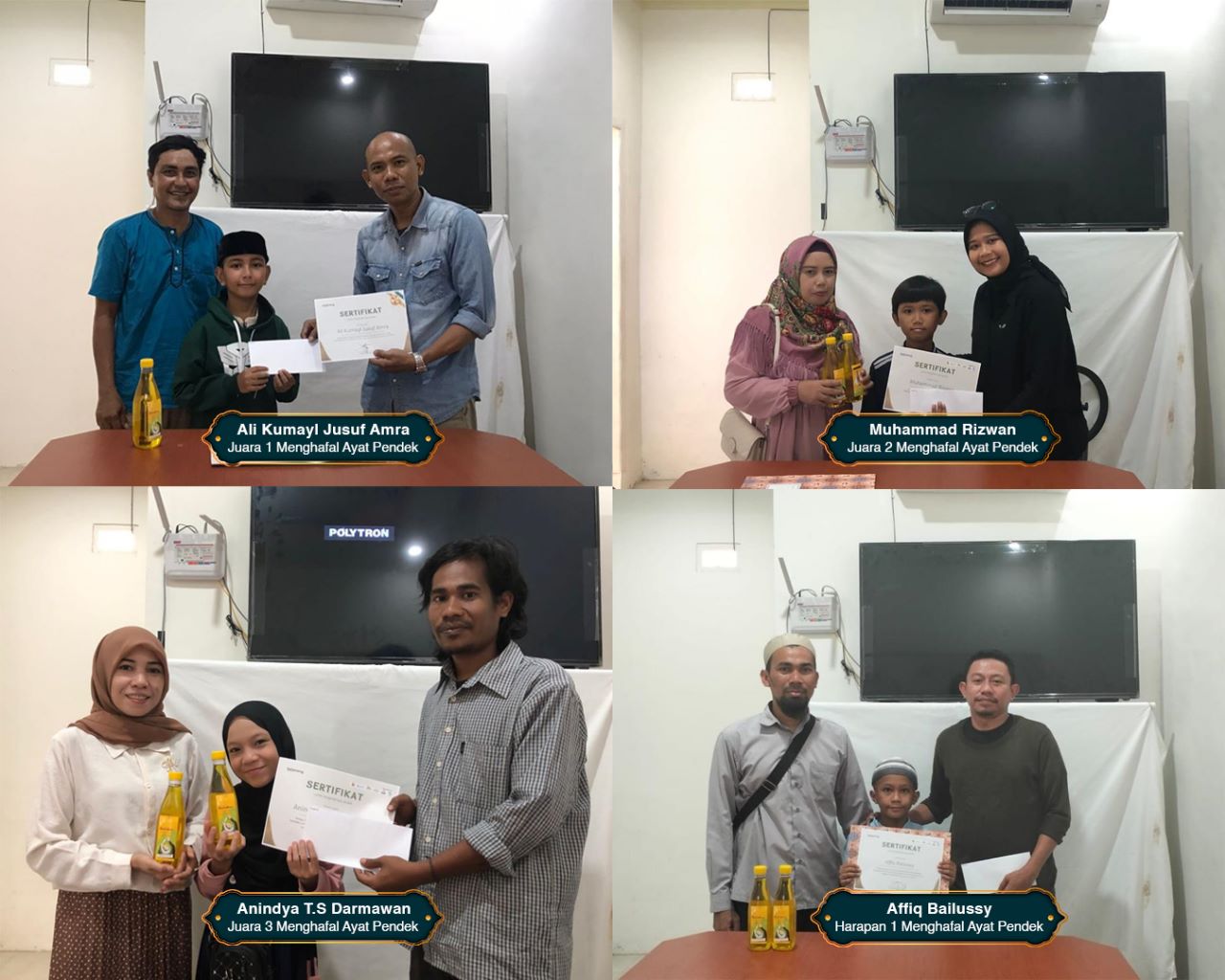 Adapun pemenang lomba hafalan ayat pendek dari juara 1 hingga juara harapan 1 itu, diberikan penghargaan berupa bonus uang tunai dan sertifikat.
