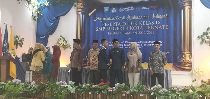 Pengumuman kelulusan yang dilaksanakan SMPN-4 Kota Ternate itu, dirangkaikan dengan acara pelepasan siswa yang dipusatkan di Jati Hotel dan Resto Ternate, Kamis (8/6/2023) sore tadi.