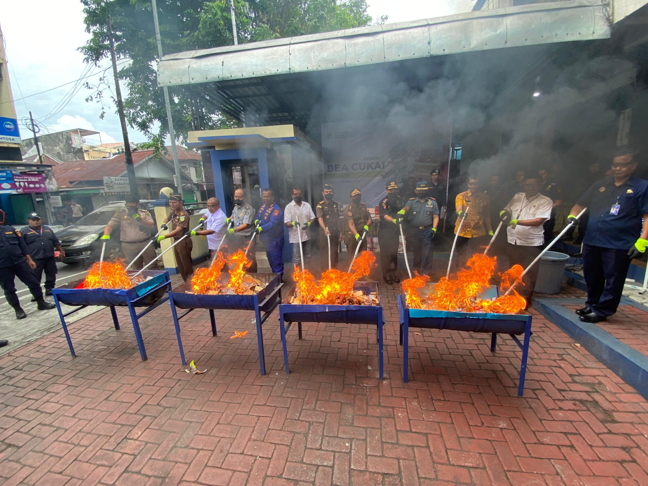 Pemusnahan sejumlah rokok ilegal dilakukan dengan cara dirusakan kemudia dibakar, agar tidak dapat digunakan kembali.