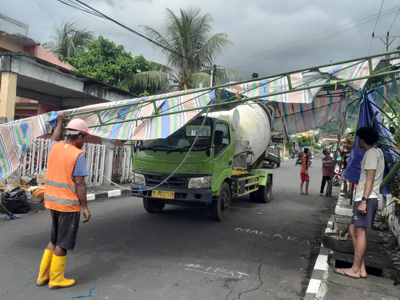Kalesang – Kecelakaan tunggal terjadi di Jalan Jeruk, Kelurahan Ubo-Ubo, Kecamatan Ternate Selatan, Kota Ternate, Jumat (21/11/2025). Sebuah truk mixer berwarna hijau dengan nomor polisi B 9592 SIN menabrak tenda rumah warga hingga kendaraan berhenti di dalam area tenda.